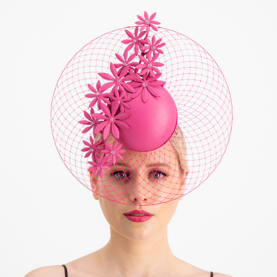 Discover creative and practical techniques to create a stunning headpiece that suspends gracefully over the face. Under the direction of Award Winning Milliner Sophie Allport, learn how to support and shape veiling into a gorgeous assemble. Combine this design with a flawless leather percher and complete with a cascading leather flower vine for a touch of a luxury.